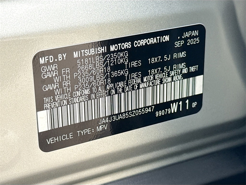 18" Alloy Wheels, 3rd row seats: split-bench, 4-Wheel Disc Brakes, 8 Speakers, ABS brakes, Air Conditioning, Alloy wheels, AM/FM radio: SiriusXM, Android Auto & Apple CarPlay, Auto High-beam Headlights, Auto-dimming Rear-View mirror, Automatic temperature control, Blind Spot Warning, Brake assist, Bumpers: body-color, Cloth Fabric Seating Surfaces, Driver door bin, Driver vanity mirror, Dual front impact airbags, Dual front side impact airbags, Electronic Stability Control, Emergency communication system: Mitsubishi Connect w/ 24-month trial, Exterior Parking Camera Rear, Four wheel independent suspension, Front anti-roll bar, Front Bucket Seats, Front Center Armrest w/Storage, Front dual zone A/C, Front reading lights, Fully automatic headlights, Illuminated entry, Knee airbag, Low tire pressure warning, Navigation System, Occupant sensing airbag, Outside temperature display, Overhead airbag, Overhead console, Panic alarm, Passenger door bin, Passenger vanity mirror, Power door mirrors, Power steering, Power windows, Radio data system, Radio: AM/FM 12.3" Navigation w/Smartphone-Link, Rear anti-roll bar, Rear Parking Sensors, Rear seat center armrest, Rear side impact airbag, Rear window defroster, Rear window wiper, Reclining 3rd row seat, Remote keyless entry, Security system, Speed control, Speed-Sensitive Wipers, Split folding rear seat, Spoiler, Steering wheel mounted audio controls, Tachometer, Telescoping steering wheel, Tilt steering wheel, Traction control, Trip computer, Turn signal indicator mirrors, and Variably intermittent wipers. Price includes: $1500 - Customer Cash. Exp. 01/05/2026 $2,000 Trade Assistance - Dealer Provided Rebate.