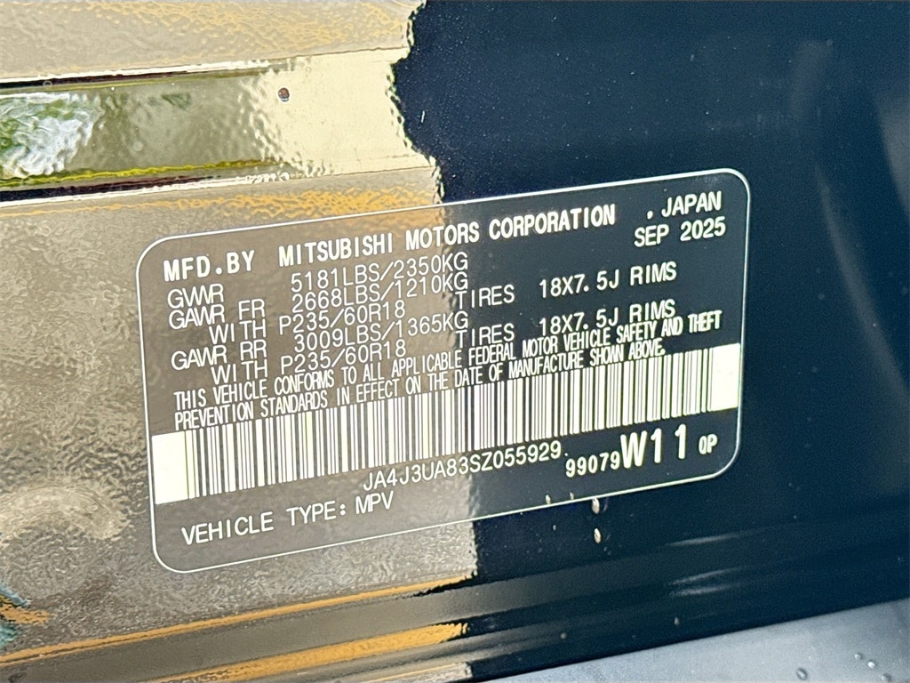 18" Alloy Wheels, 3rd row seats: split-bench, 4-Wheel Disc Brakes, 8 Speakers, ABS brakes, Air Conditioning, Alloy wheels, AM/FM radio: SiriusXM, Android Auto & Apple CarPlay, Auto High-beam Headlights, Auto-dimming Rear-View mirror, Automatic temperature control, Blind Spot Warning, Brake assist, Bumpers: body-color, Cloth Fabric Seating Surfaces, Driver door bin, Driver vanity mirror, Dual front impact airbags, Dual front side impact airbags, Electronic Stability Control, Emergency communication system: Mitsubishi Connect w/ 24-month trial, Exterior Parking Camera Rear, Four wheel independent suspension, Front anti-roll bar, Front Bucket Seats, Front Center Armrest w/Storage, Front dual zone A/C, Front reading lights, Fully automatic headlights, Illuminated entry, Knee airbag, Low tire pressure warning, Navigation System, Occupant sensing airbag, Outside temperature display, Overhead airbag, Overhead console, Panic alarm, Passenger door bin, Passenger vanity mirror, Power door mirrors, Power steering, Power windows, Radio data system, Radio: AM/FM 12.3" Navigation w/Smartphone-Link, Rear anti-roll bar, Rear Parking Sensors, Rear seat center armrest, Rear side impact airbag, Rear window defroster, Rear window wiper, Reclining 3rd row seat, Remote keyless entry, Security system, Speed control, Speed-Sensitive Wipers, Split folding rear seat, Spoiler, Steering wheel mounted audio controls, Tachometer, Telescoping steering wheel, Tilt steering wheel, Traction control, Trip computer, Turn signal indicator mirrors, and Variably intermittent wipers. Price includes: $1500 - Customer Cash. Exp. 01/05/2026 $2,000 Trade Assistance - Dealer Provided Rebate.