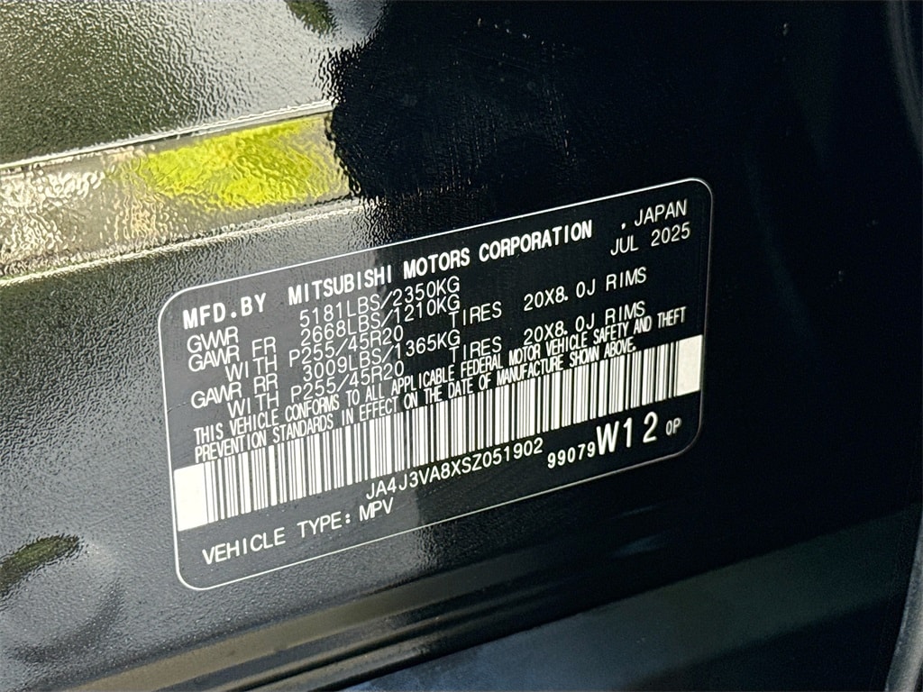 3rd row seats: split-bench, 4-Wheel Disc Brakes, 8 Speakers, ABS brakes, Air Conditioning, Alloy wheels, AM/FM radio: SiriusXM, Android Auto & Apple CarPlay, Auto High-beam Headlights, Auto-dimming Rear-View mirror, Automatic temperature control, Brake assist, Bumpers: body-color, Driver door bin, Driver vanity mirror, Dual front impact airbags, Dual front side impact airbags, Electronic Stability Control, Emergency communication system: Mitsubishi Connect w/ 24-month trial, Exterior Parking Camera Rear, Four wheel independent suspension, Front anti-roll bar, Front Bucket Seats, Front Center Armrest w/Storage, Front dual zone A/C, Front fog lights, Front reading lights, Fully automatic headlights, Garage door transmitter: HomeLink, Heated door mirrors, Heated Front Bucket Seats, Heated front seats, Illuminated entry, Knee airbag, Leather Shift Knob, Leather steering wheel, Low tire pressure warning, Navigation System, Occupant sensing airbag, Outside temperature display, Overhead airbag, Overhead console, Panic alarm, Passenger door bin, Passenger vanity mirror, Power door mirrors, Power driver seat, Power Liftgate, Power steering, Power windows, Radio data system, Radio: AM/FM 12.3" Navigation w/Smartphone-Link, Rain sensing wipers, Rear anti-roll bar, Rear seat center armrest, Rear side impact airbag, Rear window defroster, Rear window wiper, Reclining 3rd row seat, Remote keyless entry, Security system, Speed control, Speed-Sensitive Wipers, Split folding rear seat, Spoiler, Steering wheel mounted audio controls, Synthetic Leather Seating Surfaces, Tachometer, Telescoping steering wheel, Tilt steering wheel, Traction control, Trip computer, Turn signal indicator mirrors, Variably intermittent wipers, and Wheels: 20" Two-Tone Alloy. Price includes: $2500 - Customer Cash. Exp. 01/05/2026 $2,000 Trade Assistance - Dealer Provided Rebate.