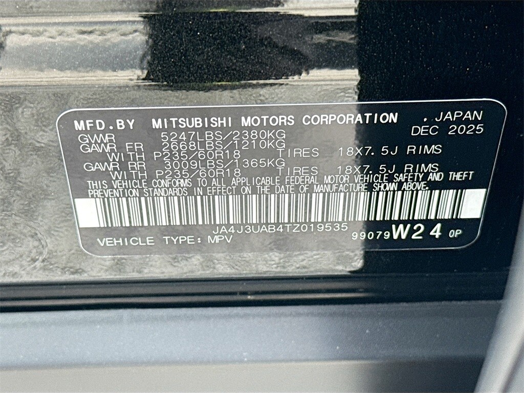 18" Alloy Wheels, 3rd row seats: split-bench, 4-Wheel Disc Brakes, 8 Speakers, ABS brakes, Air Conditioning, Alloy wheels, AM/FM radio: SiriusXM, Android Auto & Apple CarPlay, Auto High-beam Headlights, Auto-dimming Rear-View mirror, Automatic temperature control, Blind Spot Warning, Brake assist, Bumpers: body-color, Cloth Fabric Seating Surfaces, Compass, Delay-off headlights, Driver door bin, Driver vanity mirror, Dual front impact airbags, Dual front side impact airbags, Electronic Stability Control, Emergency communication system: Mitsubishi Connect w/ 24-month trial, Exterior Parking Camera Rear, Four wheel independent suspension, Front anti-roll bar, Front Bucket Seats, Front Center Armrest w/Storage, Front dual zone A/C, Front reading lights, Fully automatic headlights, Illuminated entry, Knee airbag, Low tire pressure warning, Navigation System, Occupant sensing airbag, Outside temperature display, Overhead airbag, Overhead console, Panic alarm, Passenger door bin, Passenger vanity mirror, Power door mirrors, Power steering, Power windows, Radio data system, Radio: AM/FM 12.3" Navigation with Smartphone-Link, Rear anti-roll bar, Rear Parking Sensors, Rear seat center armrest, Rear side impact airbag, Rear window defroster, Rear window wiper, Reclining 3rd row seat, Remote keyless entry, Security system, Speed control, Speed-Sensitive Wipers, Split folding rear seat, Spoiler, Steering wheel mounted audio controls, Tachometer, Telescoping steering wheel, Tilt steering wheel, Traction control, Trip computer, Turn signal indicator mirrors, and Variably intermittent wipers. Price includes: $500 - Customer Cash. Exp. 03/31/2026 $2,000 Trade Assistance - Dealer Provided Rebate.