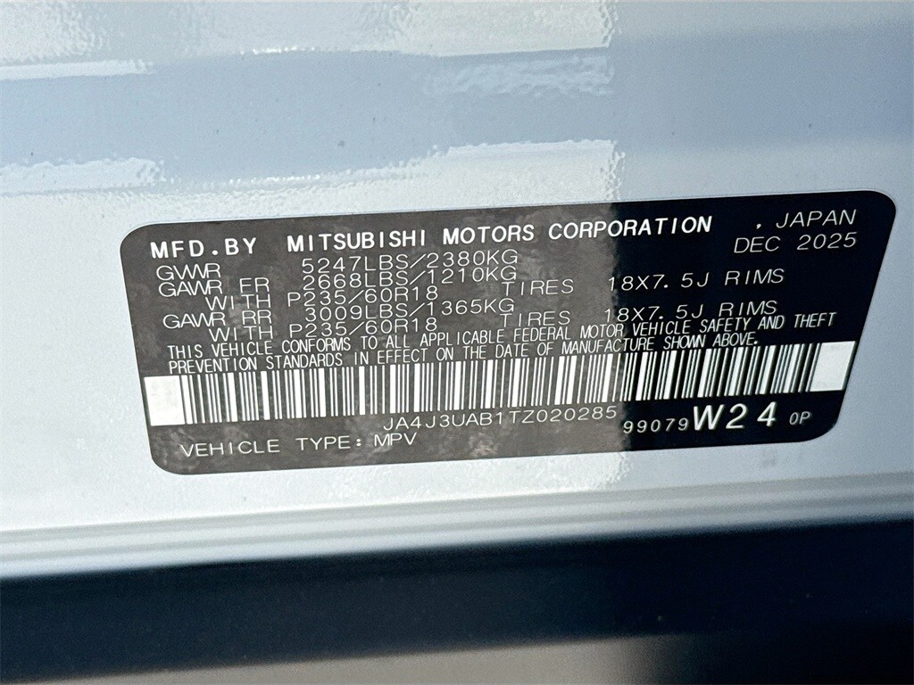 18" Alloy Wheels, 3rd row seats: split-bench, 4-Wheel Disc Brakes, 8 Speakers, ABS brakes, Air Conditioning, Alloy wheels, AM/FM radio: SiriusXM, Android Auto & Apple CarPlay, Auto High-beam Headlights, Auto-dimming Rear-View mirror, Automatic temperature control, Blind Spot Warning, Brake assist, Bumpers: body-color, Cloth Fabric Seating Surfaces, Compass, Delay-off headlights, Driver door bin, Driver vanity mirror, Dual front impact airbags, Dual front side impact airbags, Electronic Stability Control, Emergency communication system: Mitsubishi Connect w/ 24-month trial, Exterior Parking Camera Rear, Four wheel independent suspension, Front anti-roll bar, Front Bucket Seats, Front Center Armrest w/Storage, Front dual zone A/C, Front reading lights, Fully automatic headlights, Illuminated entry, Knee airbag, Low tire pressure warning, Navigation System, Occupant sensing airbag, Outside temperature display, Overhead airbag, Overhead console, Panic alarm, Passenger door bin, Passenger vanity mirror, Power door mirrors, Power steering, Power windows, Radio data system, Radio: AM/FM 12.3" Navigation with Smartphone-Link, Rear anti-roll bar, Rear Parking Sensors, Rear seat center armrest, Rear side impact airbag, Rear window defroster, Rear window wiper, Reclining 3rd row seat, Remote keyless entry, Security system, Speed control, Speed-Sensitive Wipers, Split folding rear seat, Spoiler, Steering wheel mounted audio controls, Tachometer, Telescoping steering wheel, Tilt steering wheel, Traction control, Trip computer, Turn signal indicator mirrors, and Variably intermittent wipers. Price includes: $500 - Customer Cash. Exp. 03/31/2026 $2,000 Trade Assistance - Dealer Provided Rebate.